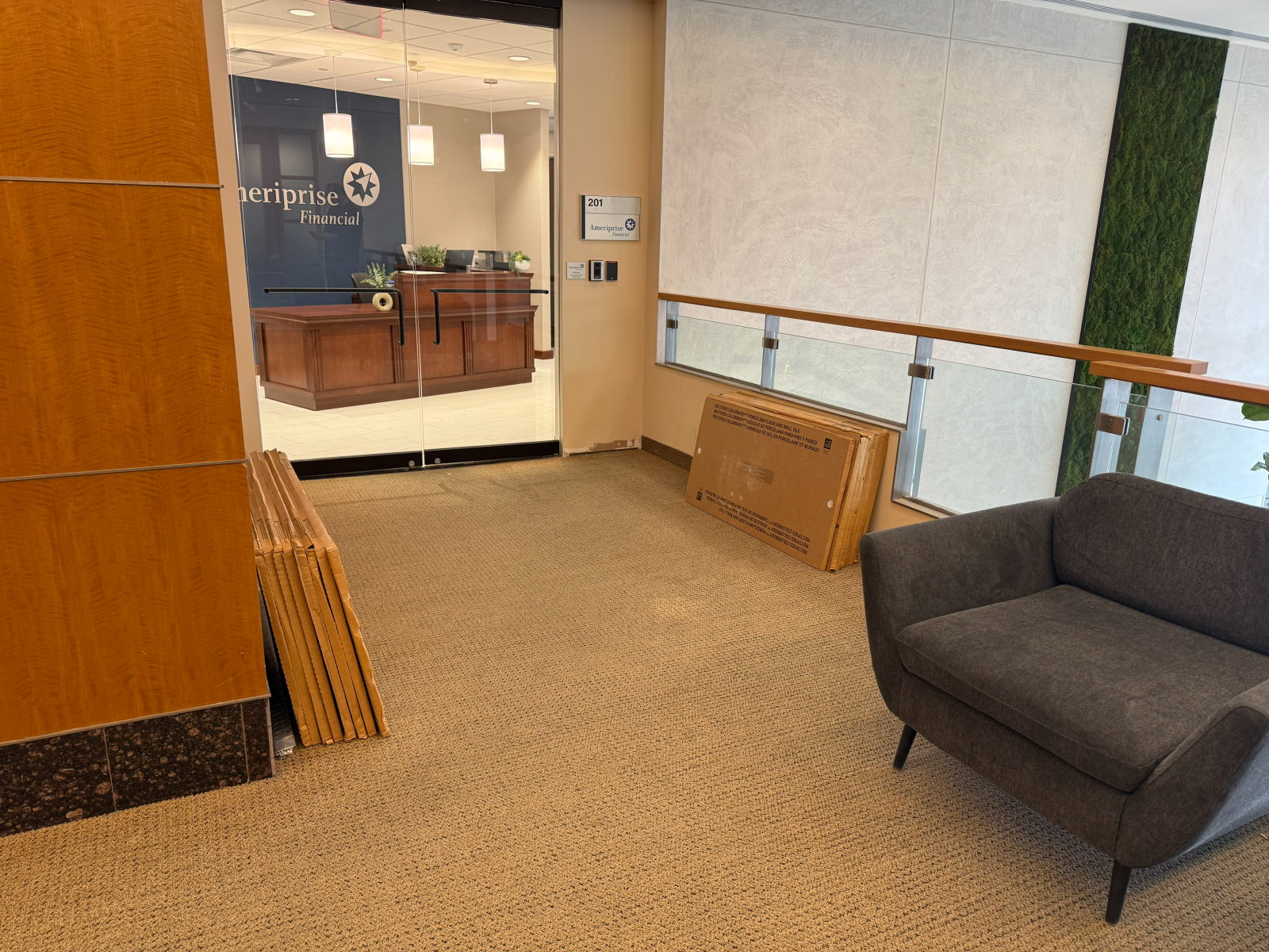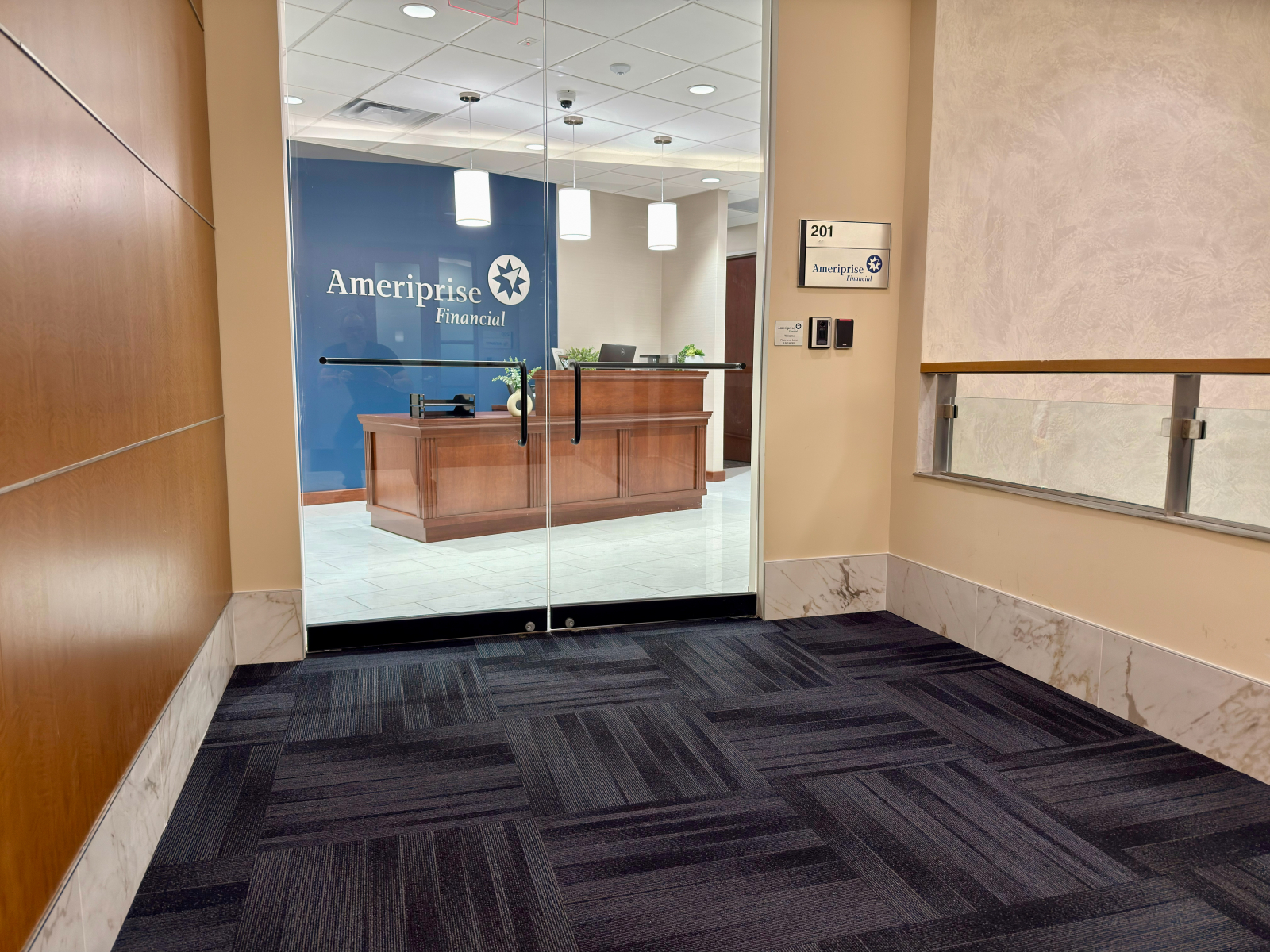 By replacing the old materials with high-polished tile and professional carpet, we created a visual impact that is immediately apparent. The new design features a sophisticated balance of warm wood-paneled walls and sleek grey furniture. The high-polished tile reflects the overhead lighting to create a bright and open feel, while the new glass entry door for the Ameriprise Financial suite adds a layer of modern professionalism.